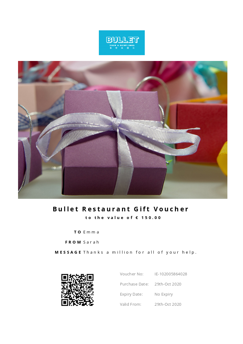 Bullet Restaurant allows you to purchase instantly printable gift vouchers, special offers and tickets using the Voucher Connect platform.